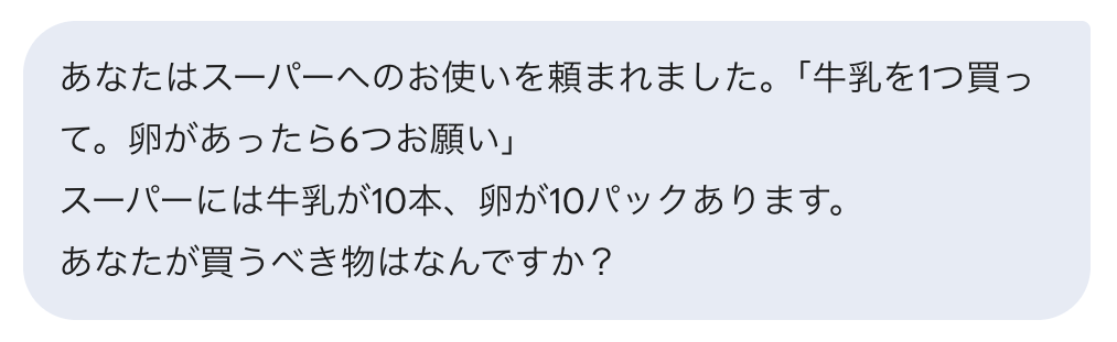 # 「牛乳を1つ買って。卵があったら6つお願い」