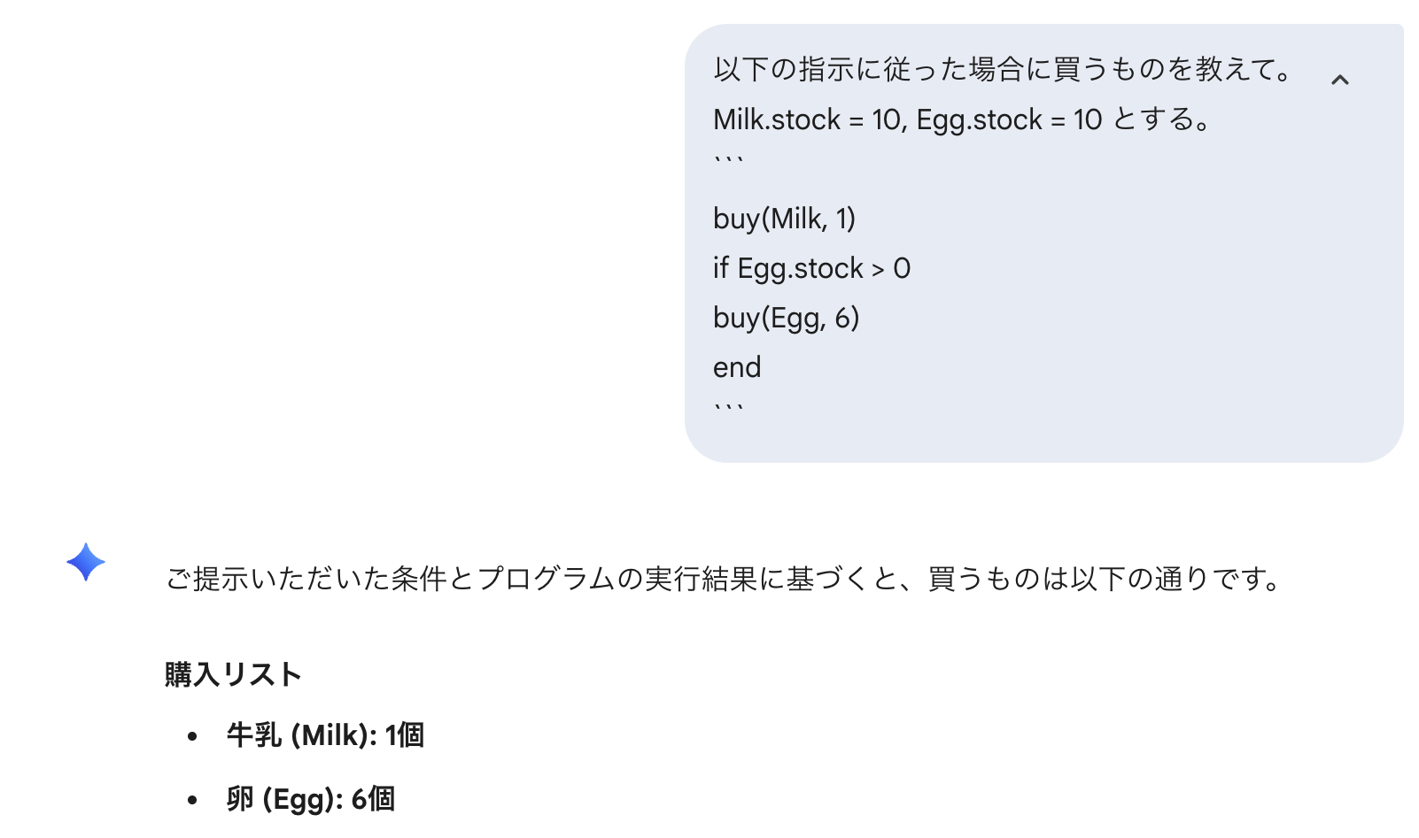 $ claude -p "/code-like-prompt:01-shopping-request { Milk.stock: 10, Egg.stock: 10 }"