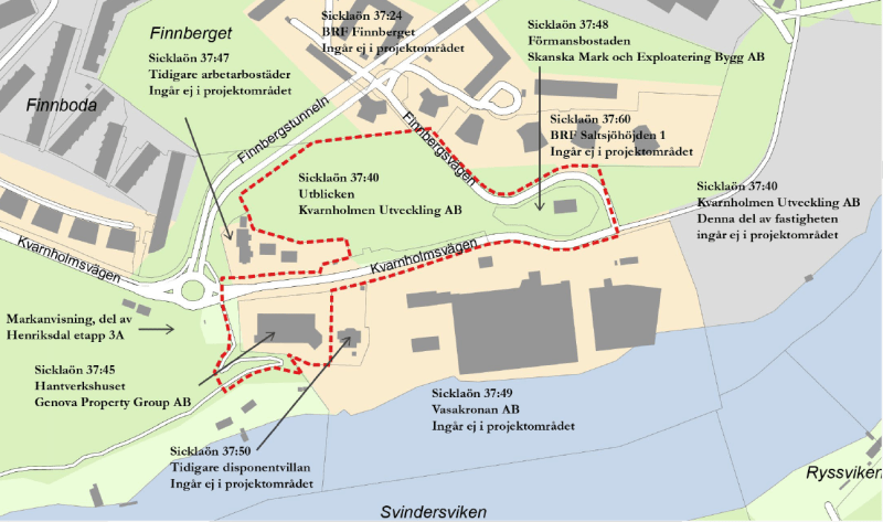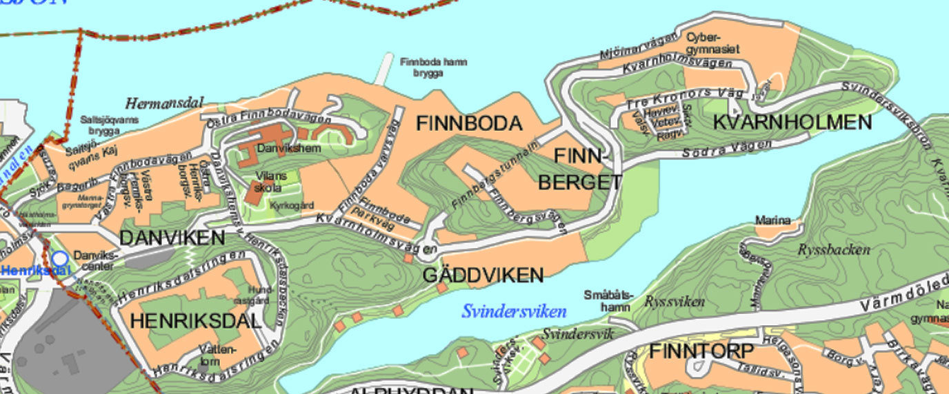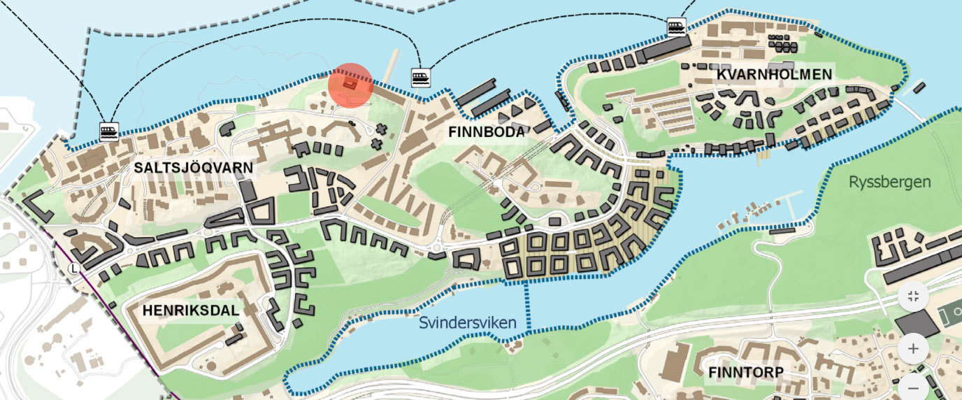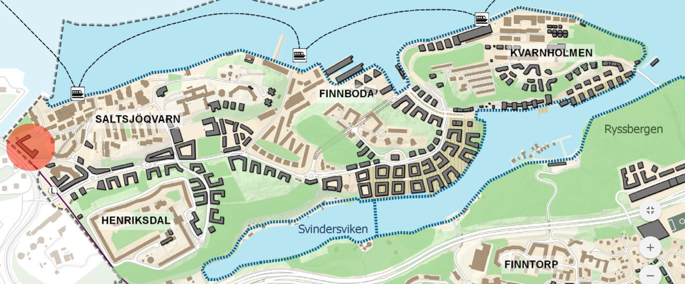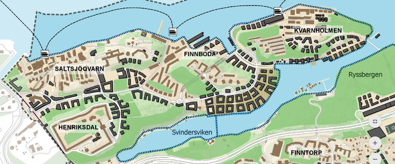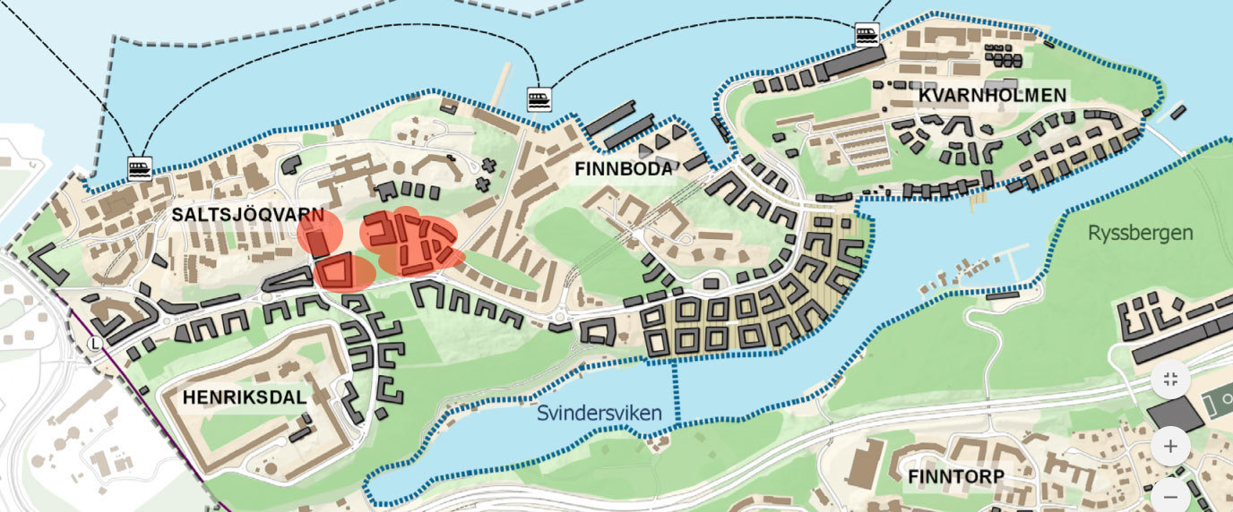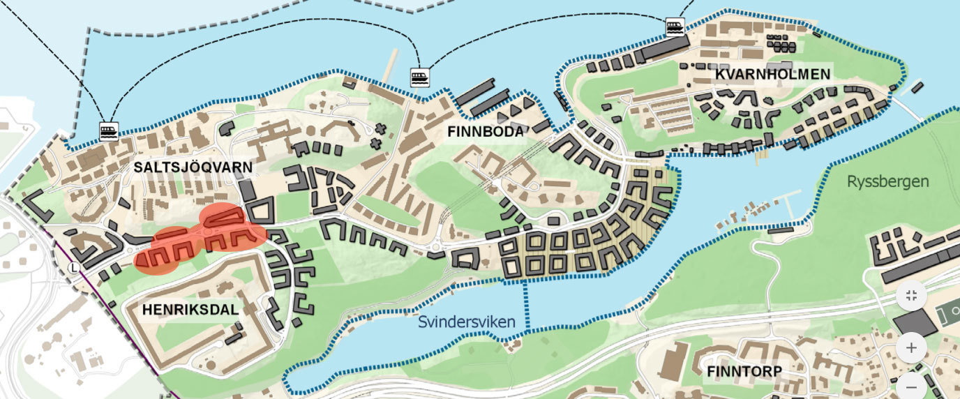 Nacka bygger stad och förvandlar nordvästra Sicklaön med Henriksdalsberget, Saltsjöqvarn, Finnboda, Finnberget och Kvarnholmen till (mycket) tät stad med fler än 20.000 invånare fram till 2030. Här kommer den planerade bebyggelsen.
