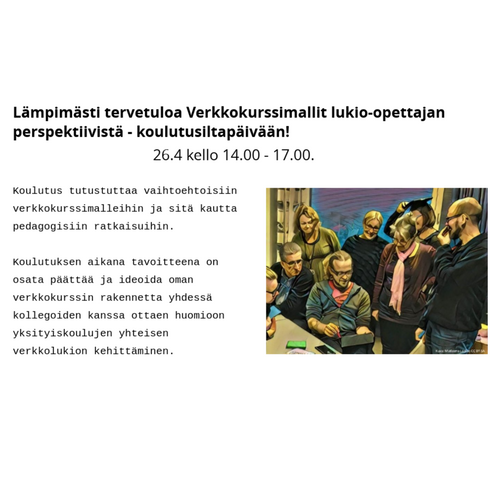 Koulutus tutustuttaa vaihtoehtoisiin verkkokurssimalleihin ja sitä kautta pedagogisiin ratkaisuihin. Koulutuksen aikana on tavoitteena osata päättää ja ideoida oman verkkokurssin rakennetta yhdessä kollegoiden kanssa ottaen huomioon yksityiskoulujen yhteisen verkkolukiotoiminnan kehittäminen.