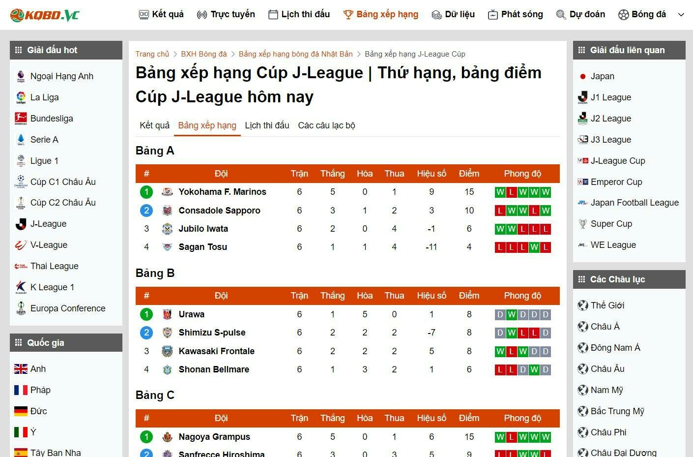 Bảng xếp hạng Cúp J-League là công cụ hữu ích KQBD.VC cung cấp giúp người hâm mộ có cái nhìn chi tiết về giải đấu bóng đá này tại Nhật Bản. Thông qua bảng xếp hạng, bạn có thể theo dõi hiệu suất và khả năng cạnh tranh của các đội bóng một cách rõ ràng.