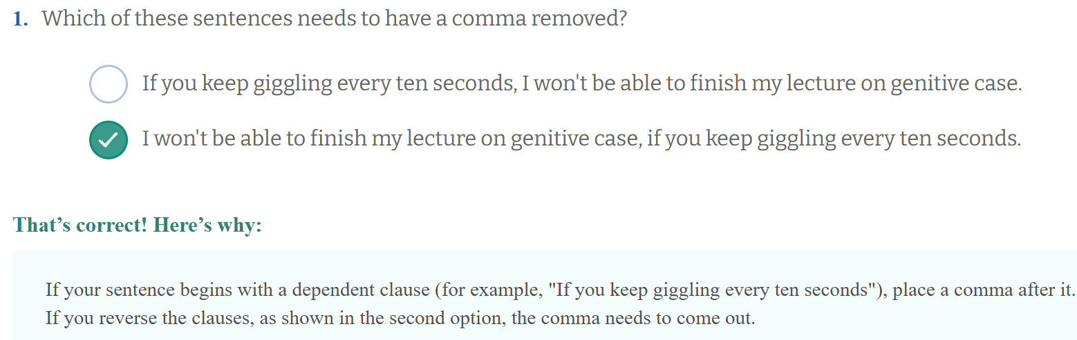 Sivulause + päälause -> pilkku pakko. Sivulause alkaa esim. sanoilla IF, WHEN, ALTHOUGH.