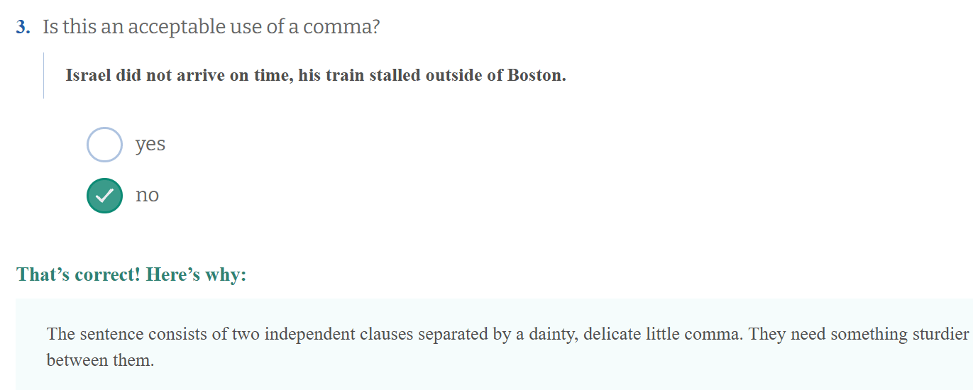 Esim. "Koala bears are not actually bears, they are marsupials." Tämä on väärin koska on kaksi itsenäistä päälausetta. Siinä pitää joko laittaa sidesana tai tehdä niistä erillistä lausetta. Kolmas vaihtoehto on käyttää puolipiste, mutta se on hieman harvinaisempi.