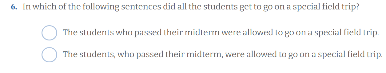 Ensimmäisessä lauseessa who passed their midterm ei ole pilkkujen väliin, eli on tärkeä tieto, joka ei voi jättää pois. Se kertoo mitkä opiskelijat pääsivät matkalle → vain ne, jotka läpäisivät välikokeen.