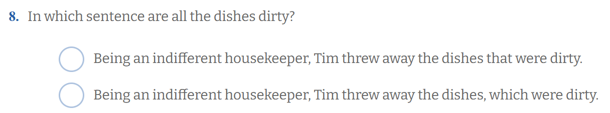 Ensimmäisessä lauseessa the dishes that were dirty on rajaava relatiivilause. Se kertoo, mitkä astiat Tim heitti pois → vain likaiset astiat, ei kaikkia.