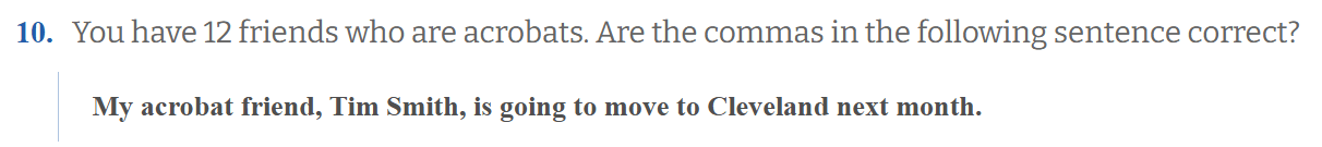 Koska sinulla on 12 akrobaattikaveria, täytyy mainita nimi tai muu rajaava tieto, jotta henkilö voidaan tunnistaa. Tämä tieto ei ole ylimääräistä lisätietoa, joten sitä ei eroteta pilkuilla.
