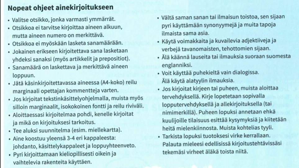 ESSAY STRUCTURE: Pitää olla LYHYT alku ja loppu!! Pari - 3 riviä riittää. Keskikappeleet = aiheen käsittely. Niitä pitäisi olla 2-4. Jos on vain 1, näyttää siltä, että aiheen käsittely jää yksipuoliseksi. Tämä vaikuttaa arvosanaan.