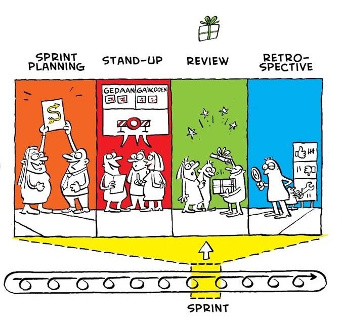 - Team blikt samen terug op het hele proces: wat ging goed, wat kan beter in de volgende sprint? Hoe kunnen we sneller werken?