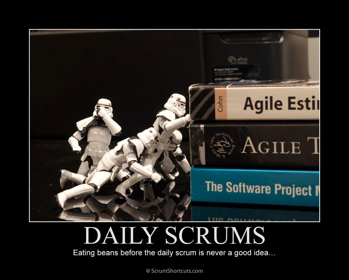 Dagelijks vergaderen team en Scrummaster om rond het Scrumbord deze 3 vragen te beantwoorden