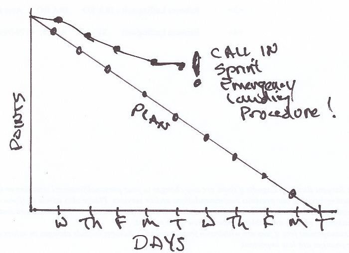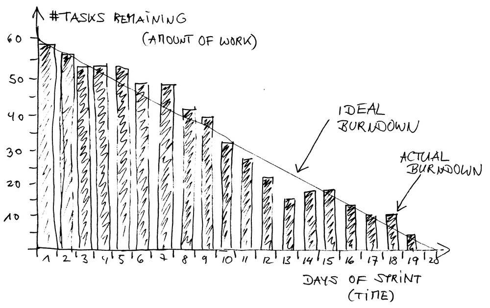 - Op de burndown chart houdt de scrum master bij hoeveel punten er verzet zijn (volgens de definition of done) en hoeveel er nog over zijn