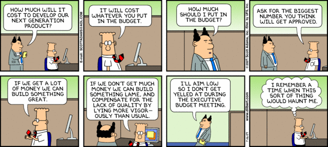 De manager van de schatter vermenigvuldigt het aantal uren met twee - er is altijd meer werk dan gedacht en het risico ligt bij de leverancier.