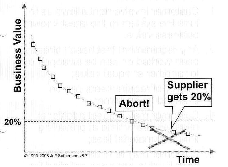 - De klant kan besluiten dat de volgende sprint de laatste is. In dat geval betaalt hij de kosten van de gerealiseerde sprints plus 20% van de restwaarde van het contract. Dat is het principe van 'money for nothing'