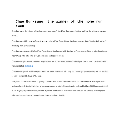 Chae Eun-sung, the winner of the home run race, said, "I liked Yoo Kang-nam's batting ball, but the prize money was more..."