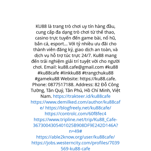 Website: https://ku88.cafe. KU88 là trang trò chơi uy tín hàng đầu, cung cấp đa dạng trò chơi từ thể thao, casino trực tuyến đến game bài, nổ hũ, bắn cá, esport... Với tỷ nhiều ưu đãi cho thành viên đăng ký, giao dịch an toàn, và dịch vụ hỗ trợ túc t