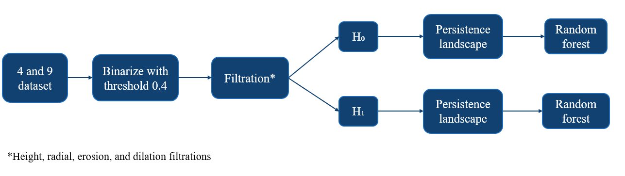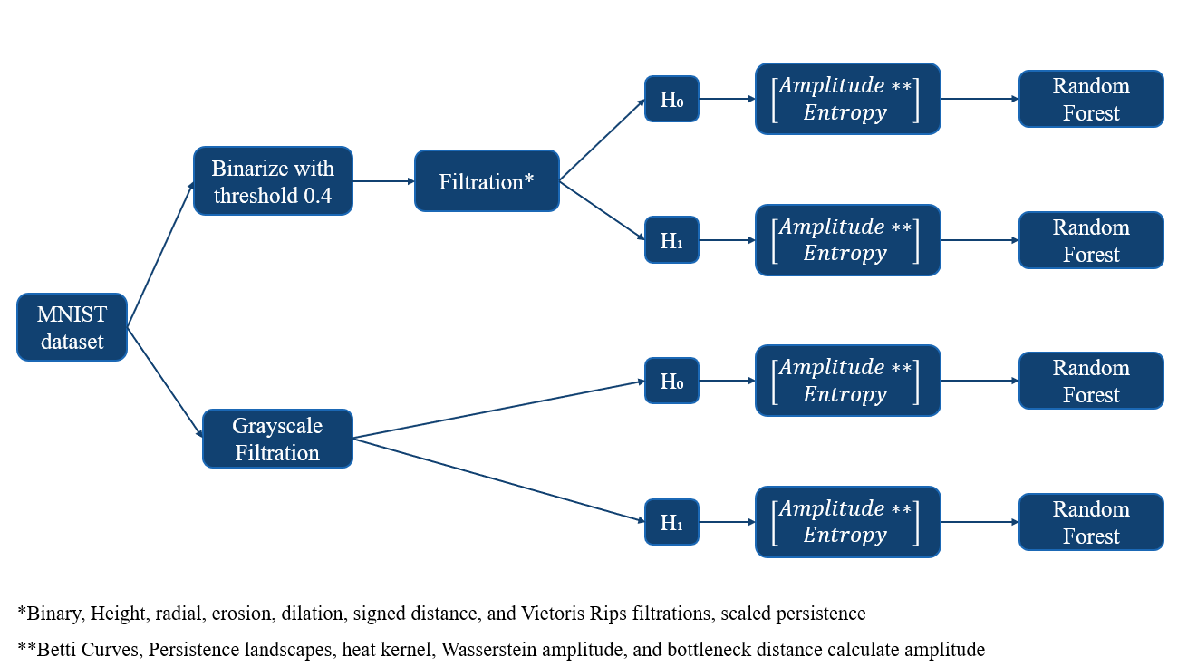 - We adapt the methodology presented in Garin & Tauzin's conference paper [1] that uses TDA to classify handwritten numbers based on the following pipeline: