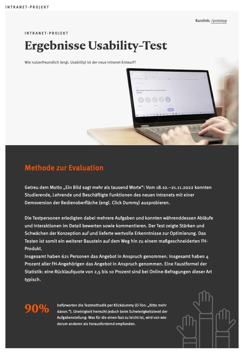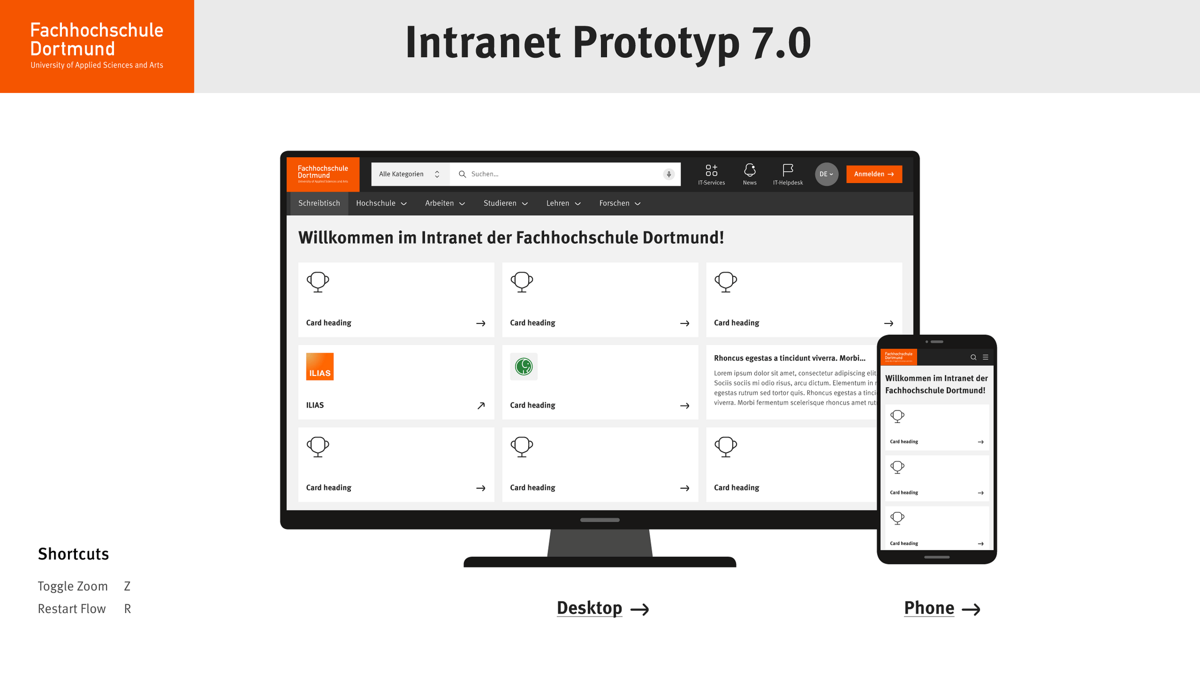 In organisierten Workshops mit den Mitarbeitenden, Lehrenden und Studierenden der FH Dortmund wurden zuerst die Erwartungshaltung und Bedürfnisse an Funktionalität, Design und Informationsstruktur definiert, konzeptionell ausformuliert und entsprechend einer agilen Arbeitsweise prototypisch umgesetzt.