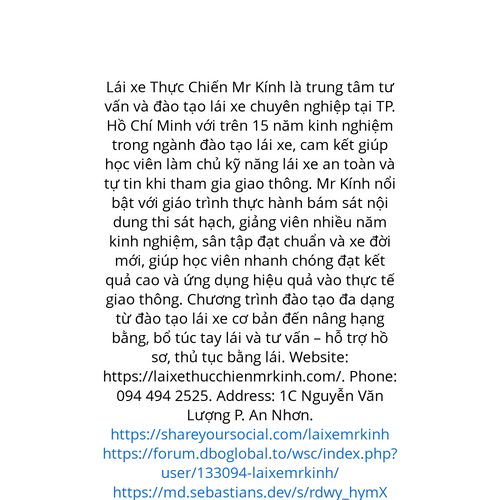 Website: https://laixethucchienmrkinh.com/. Trung tâm Lái xe Thực Chiến Mr Kính là đơn vị đào tạo lái xe uy tín tại TPHCM với hơn 15 năm kinh nghiệm trong ngành đào tạo lái xe, cam kết giúp học viên làm chủ kỹ năng lái xe an toàn và tự tin khi tham g