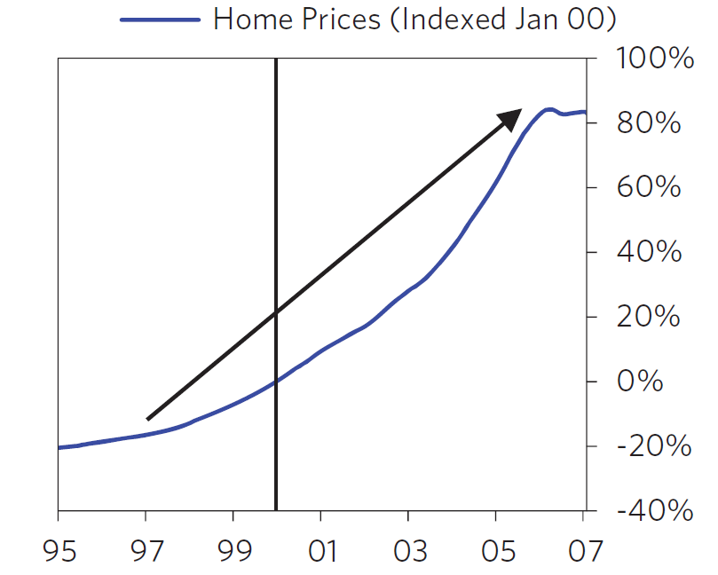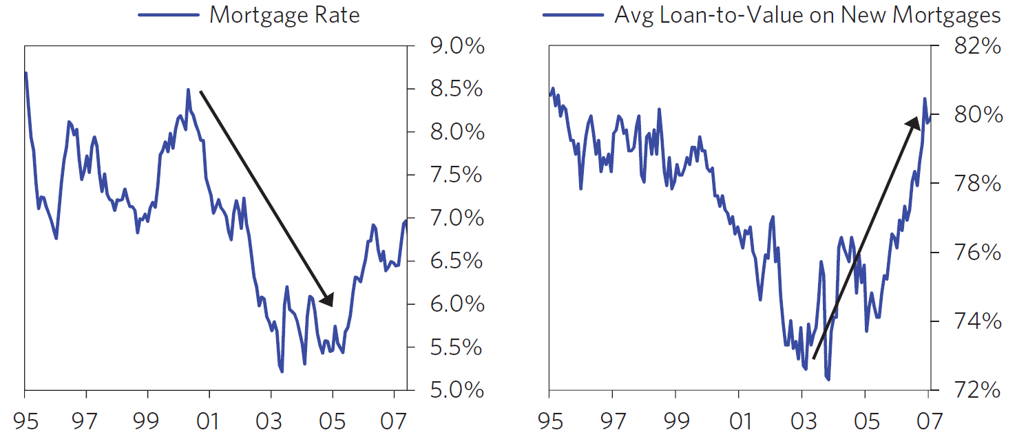 La inflación se mantuvo en un 2-3,5% (considerado no preocupante). Los tipos a corto plazo estuvieron por debajo de la inflación (coste real de financiación negativo). Incluso cuando la Fed empezo a subir tipos a mediados de 2004, los intereses nominales a largo plazo se mantuvieron planos y los reales declinaron.