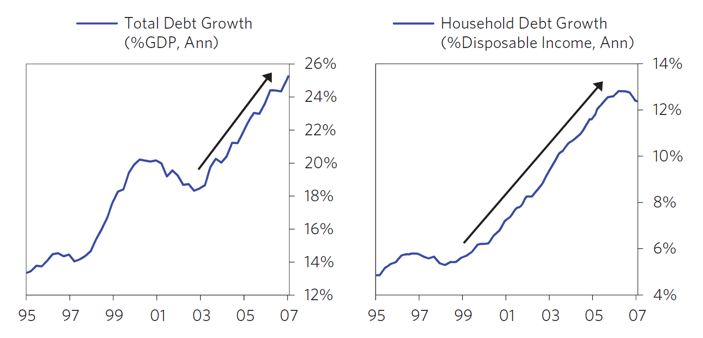 Los incrementos en el ratio deuda/GDP (o PIB) son muy rápidos durante la burbuja.