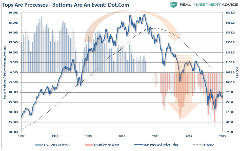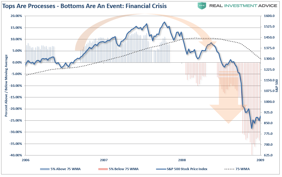 Cuando los precios han sido sostenidos mediante compras apalancadas y el mercado está muy largo, apalancado y sobrevaluado, llega el cambio de tendencia.