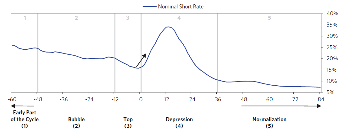 Los tipos de interés tienden a subir más rápido hacia el final de la burbuja y bajan muy rápido durante la fase inicial de la depresión que puede durar 24 meses.