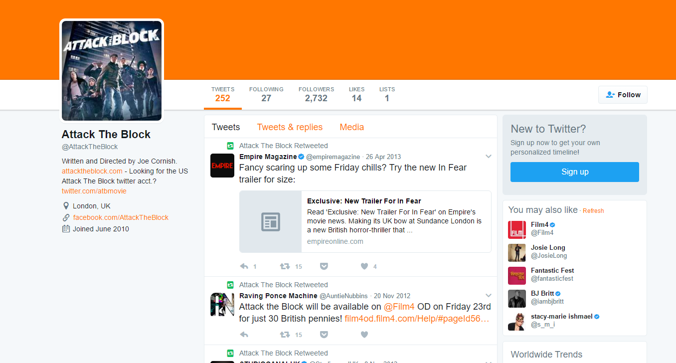 Due to its low budget and the target audience of the film, Attack The Block used a lot of online marketing during its campaign and through social media, used a lot of viral marketing to quickly spread information about the film and to create a buzz. Most forms of digital marketing like social media and YouTube are free meaning costs can be saved here and that the core target audience for our film can be reached easily.