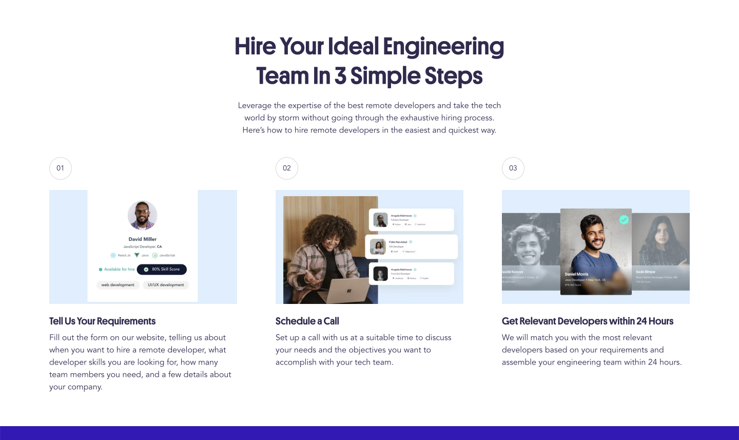 „Najměte svůj ideální vývojářský tým ve 3 krocích“—poukazuje na problém, který zákazník řeší.