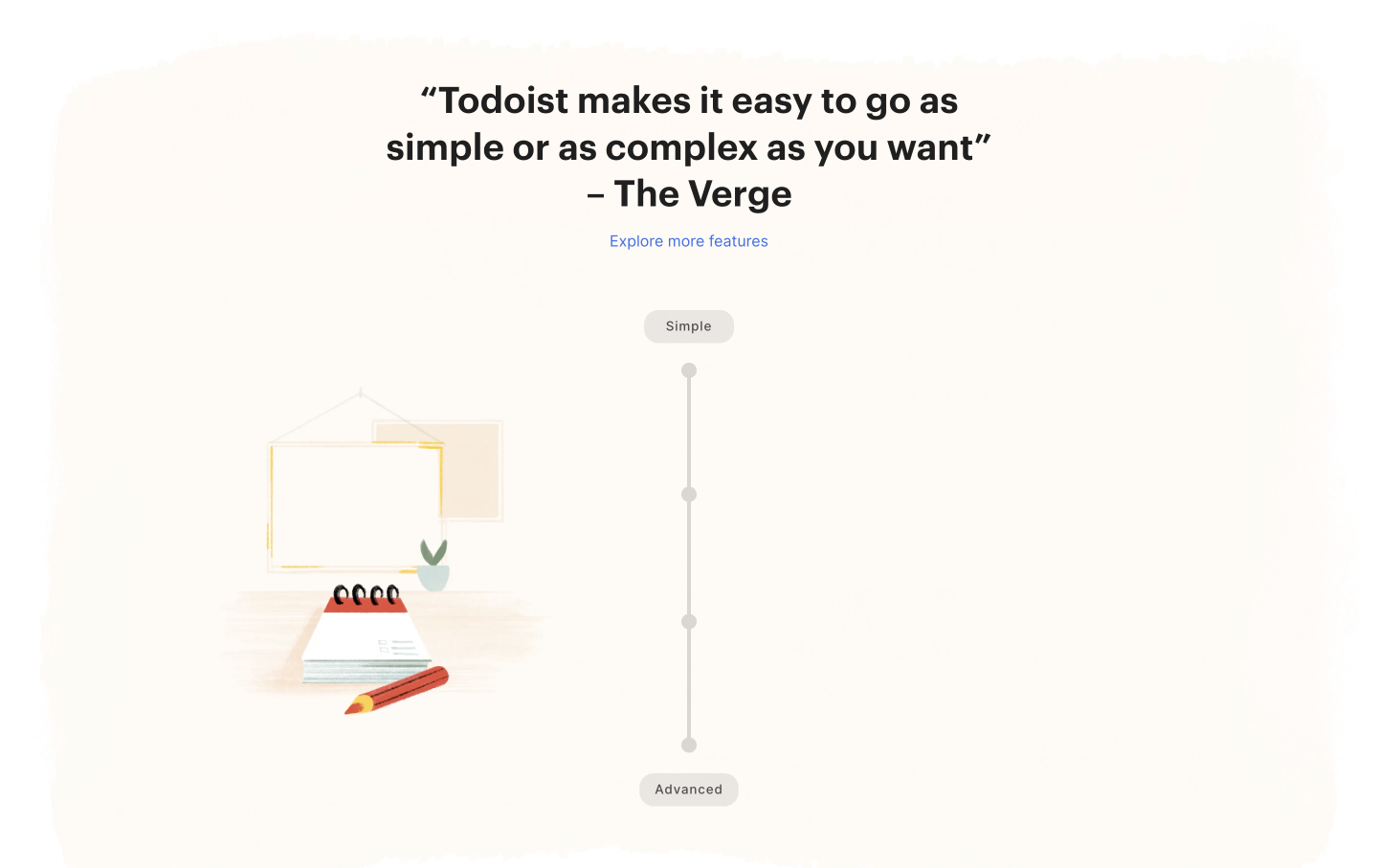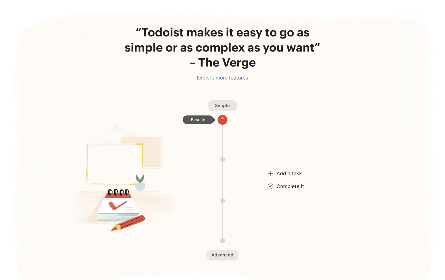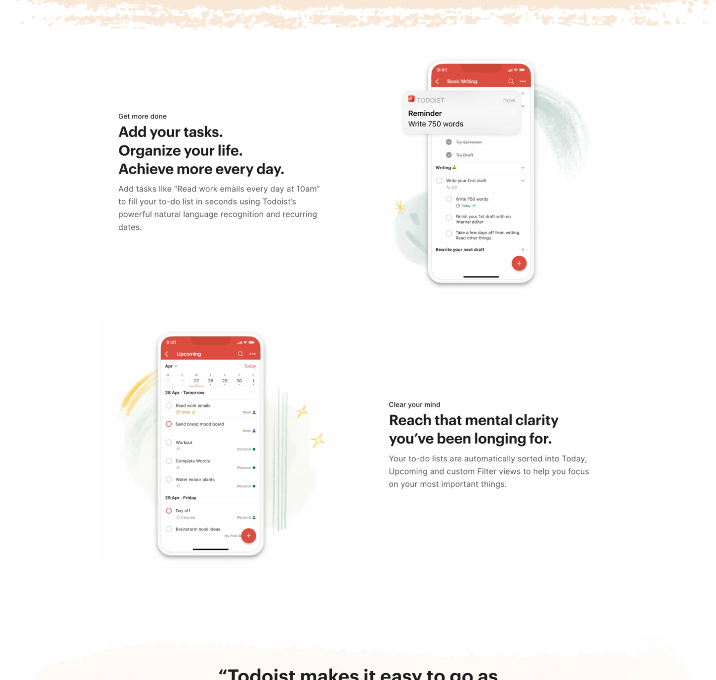 „Dosáhněte klidu s Todoistem“ = trochu abstraktní nadpis, ale je kreativní a neurazí. Vše již bylo řečeno. Takže si to tvůrci webu mohou dovolit.