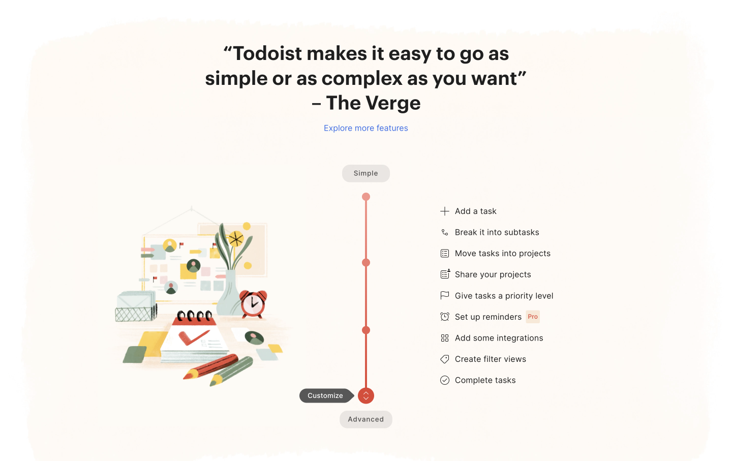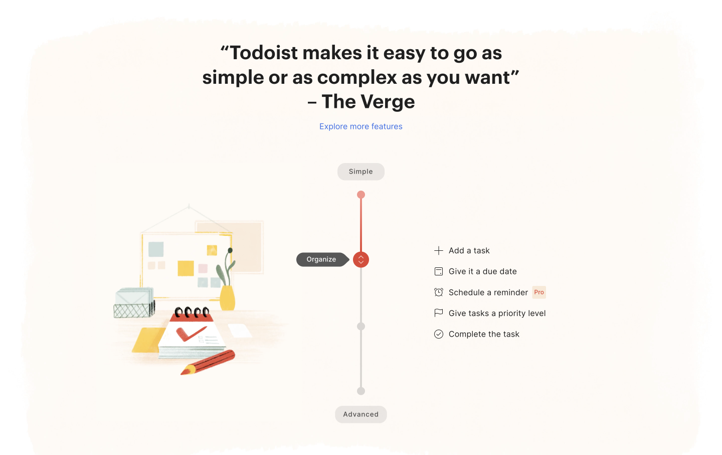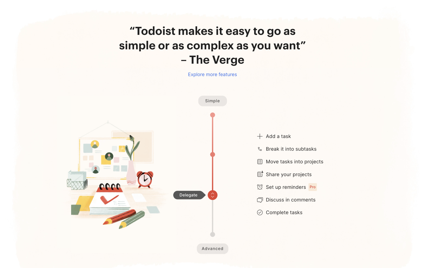 „Dosáhněte klidu s Todoistem“ = trochu abstraktní nadpis, ale je kreativní a neurazí. Vše již bylo řečeno. Takže si to tvůrci webu mohou dovolit.