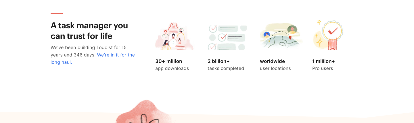 „Tvoříme Todoist 15 let a 346 dní“ = zajímavý prvek—číslo pravděpodobně automaticky roste a je konkrétní a aktuální. Zvyšuje vnímaní kvality produktu.