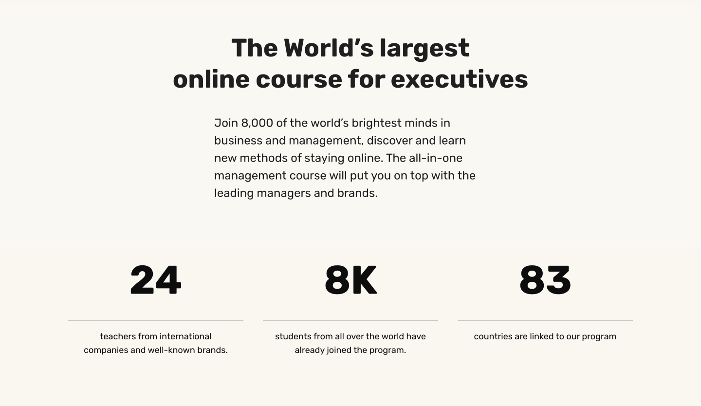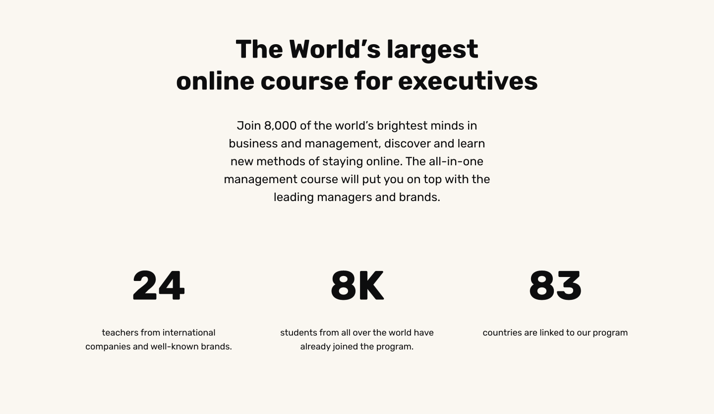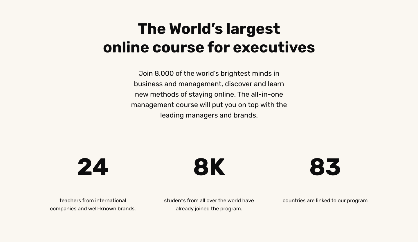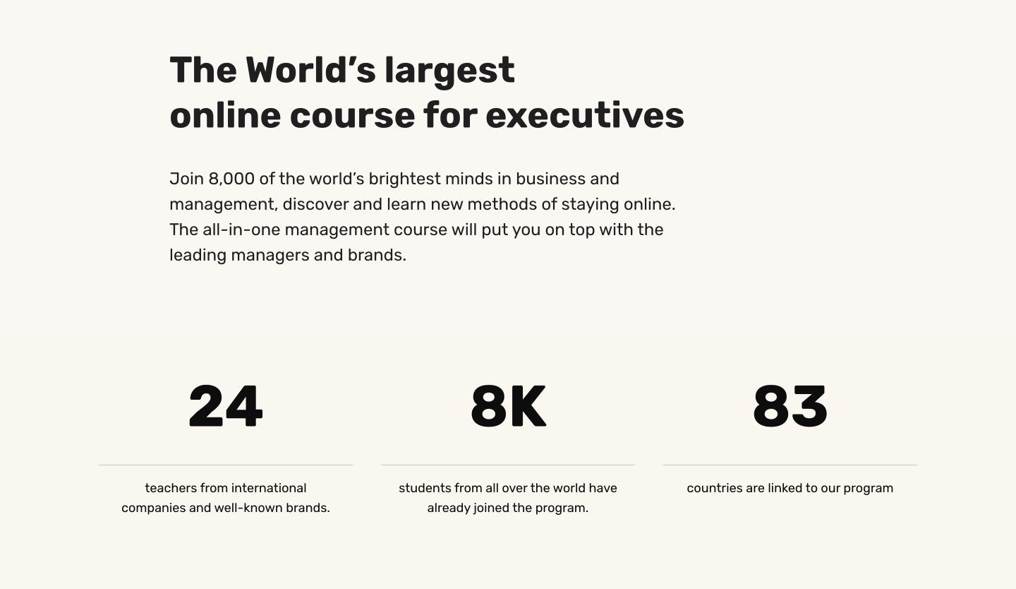 Další – pouze textová – sekce navazuje na představení kurzu a snaží se namotivovat potenciální uchazeče na zápis do kurzu pomocí čísel a dat, sociálního důkazu a Stádového efektu.