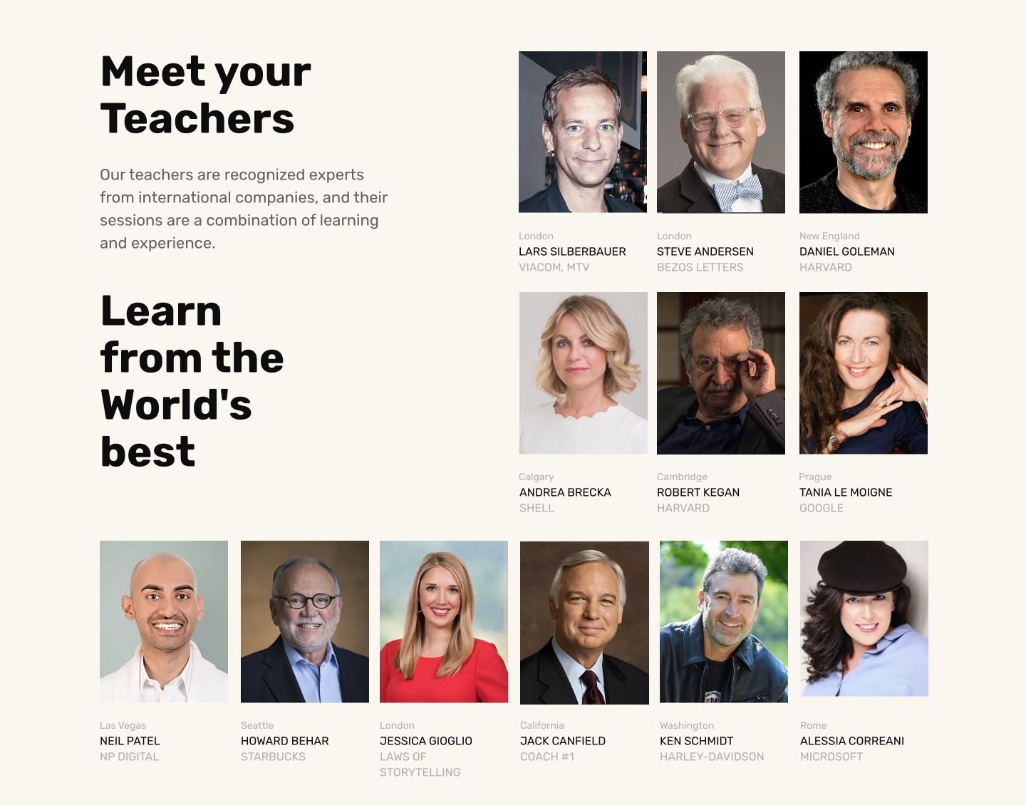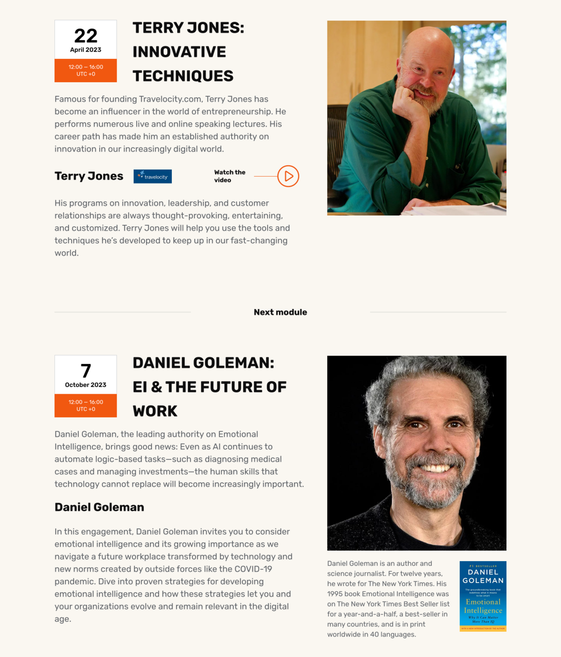 U některých vyučujících jsou použité prvky sociálního důkazu. Např. jakou knihu napsali nebo pro jakou společnost pracují. Tyto prvky mají přidanou hodnotou. Daného člověka si dokážete vhodně zaškatulkovat a spojit s firmou, oborem nebo produktem (vizualizace). Funguje to lépe než kdybyste jen vypsali holá jména.