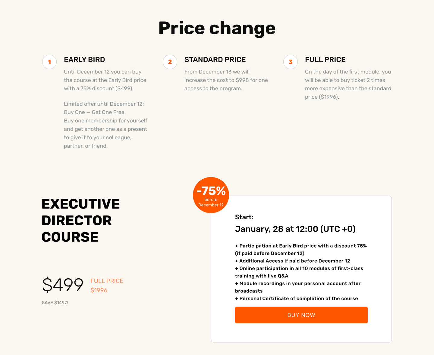 Ukažte, za jakou cenu produkt koupíte. Vedle přidejte cenu, za kterou si kurz koupíte v budoucnu. Dochází k porovnávání ceny (efekt rámování) = už jste si přečetli o tom, jaká je reálná cena kurzu a že poroste… Máte očekávání. Aktuální nízká cena je proto v porovnání s plnou cenou opravdu nízká a přijde vám výhodná.