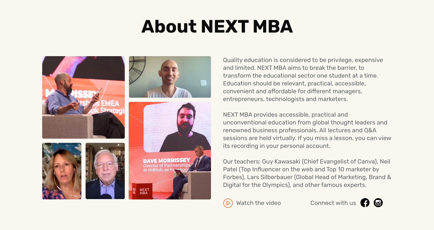 NEXT MBA je vzdělávací program, ve kterém profesionálové předávají své znalosti online v oblastech leadershipu nebo digitálního marketingu.