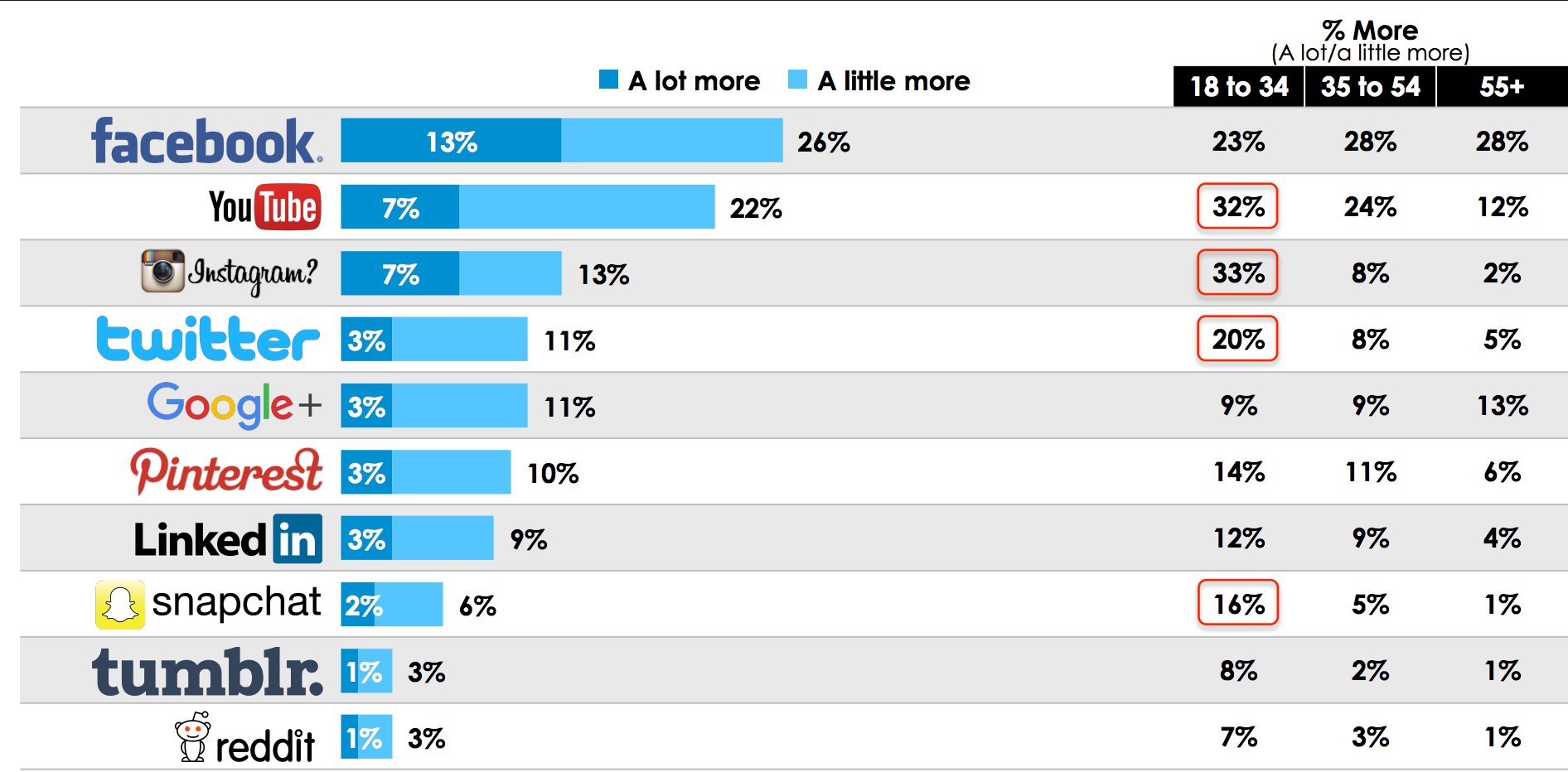 Millennial’s time spent on Instagram, Twitter and YouTube growing at a faster rate than older segments.
