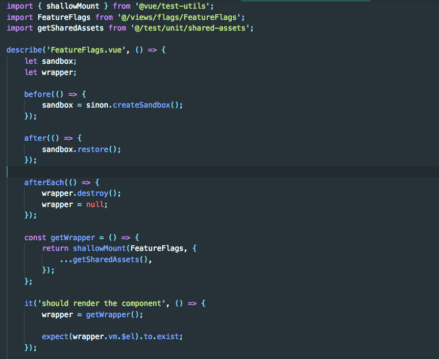 - Basic setup is similar to a Mocha/chai/sinon file, but:
