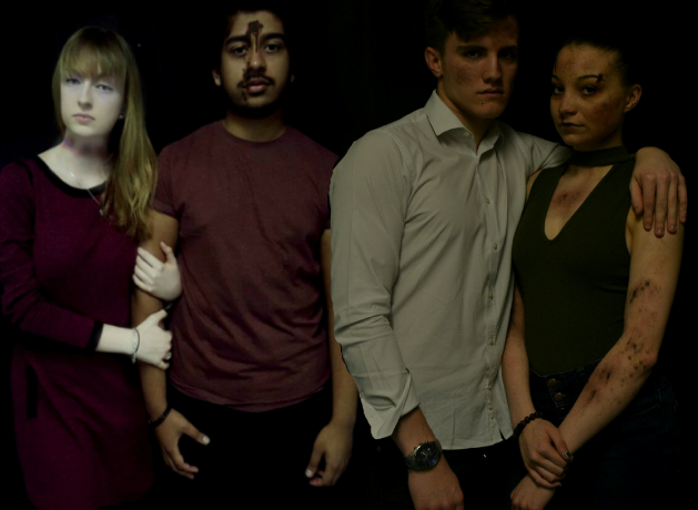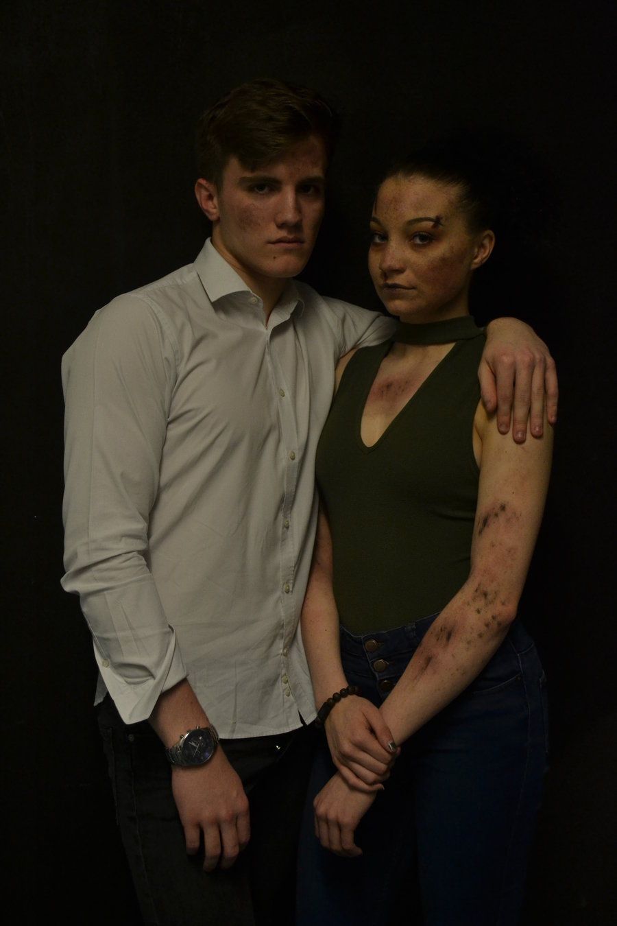 There were no props used in our film poster, as we did not want to over complicate the photo and make it look to busy. However, we did use costume and makeup. The special effects make-up that we used allowed us to create the wounds for each character, which you see that they have gained after you watch the trailer. The costumes differ from actor to actor to fit their character type. For example, we chose a white shirt and dark coloured trousers for Kyle (Luke Bauckham) so that we could emphasise the bruises on him in comparison to his light t-shirt, and it is also to show that his character is formal, and likes to dress well. For Natalie (Amber Ellis) she wore a black dress, which shows that even though they are a couple, her and Kyle are too very different people looking at their opposite colour choices. The dress also highlights the dark markings on her arms and chest, as they are similar colours. Lastly, Chelsea (Myself) and Dave (Vikesh Babajee) wore similar colours to show that they are a closer couple than the other two.