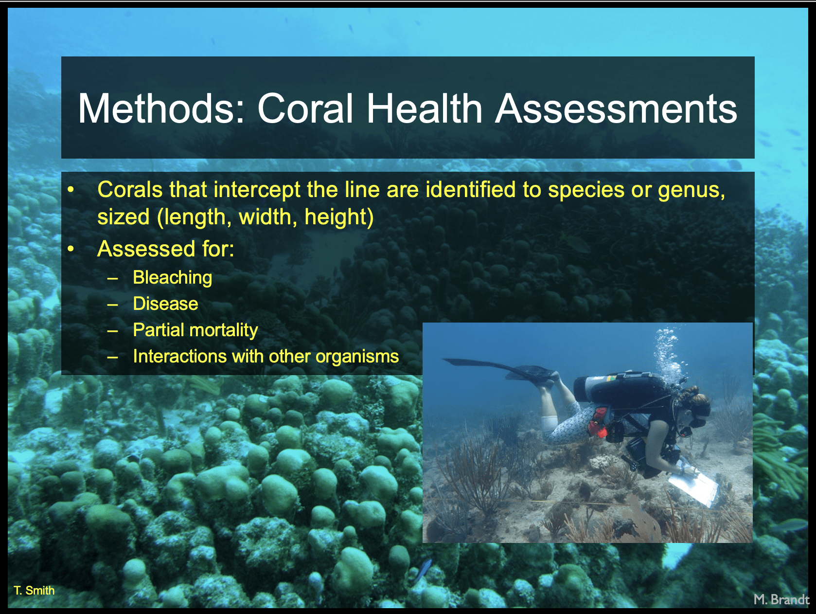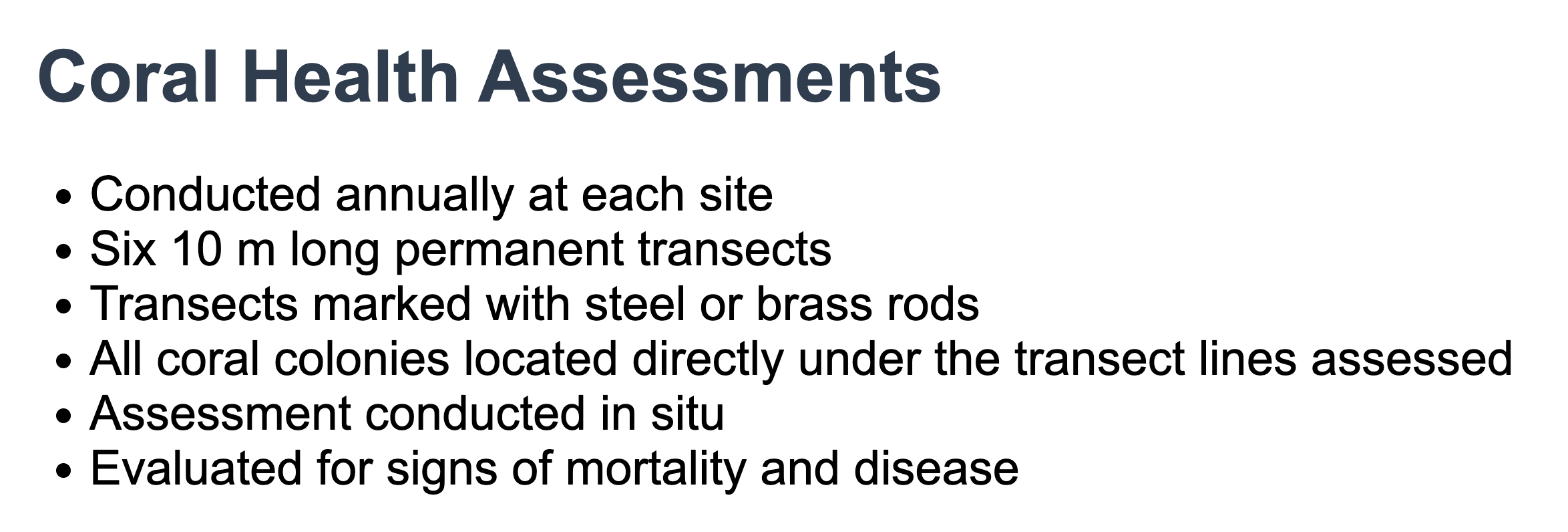- Used the US Virgin Islands Territorial Coral Reef Monitoring Program (TCRMP) methodology