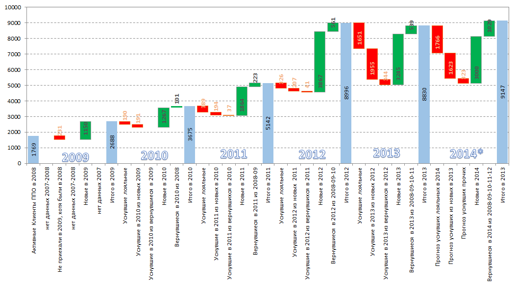 Каскадная диаграмма изменения клиентской базы