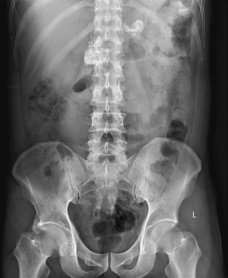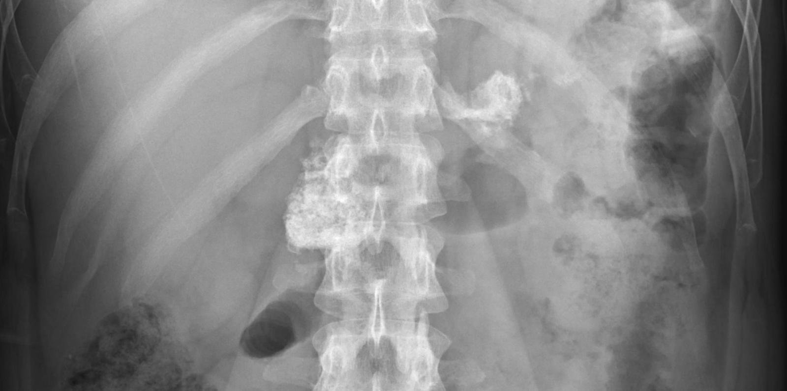 A. Negative study B. Renal stone C. Calcified adrenal gland D. Calcified pancreas