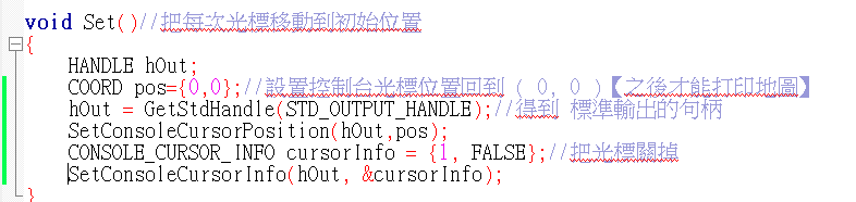 COORD pos={0,0};//設置控制台光標位置回到 ( 0, 0 )【之後才能打印地圖】