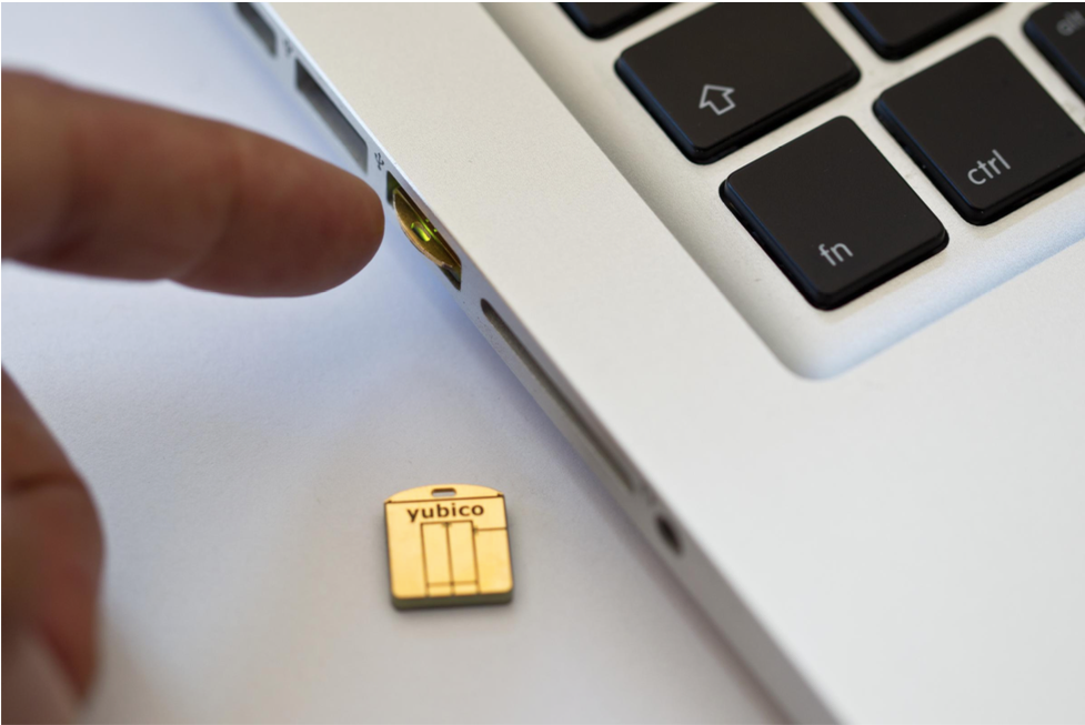 A YubiKey is a small hardware device that offers two-factor authentication with a simple touch of a button.