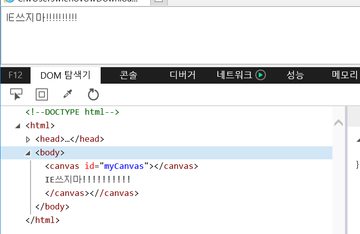 <canvas id="myCanvas">IE쓰지마!!!!!!!!!!</canvas>그럴땐 이렇게 대체 문자열을 넣어주면..