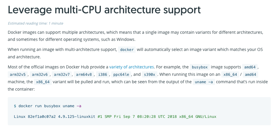 - 도커가 지원하는 플렛폼을 늘려가고 있지만 한번 만들어진 이미지가 모든 환경에서 동작하는 것은 아니기 때문에 주의가 필요하다.