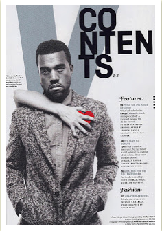 For my contents page I used the Kanye contents page as inspiration. I liked the layout of the page so I decided to use it. I made a 'Y' for the background of the page which stands for YOUNG. I used the 'features and fashion' from the contents page and adapted it to my magazine as my magazine is purely music. Instead of fashion I changed it to album reviews so that it would fit in with the themes in my magazine.