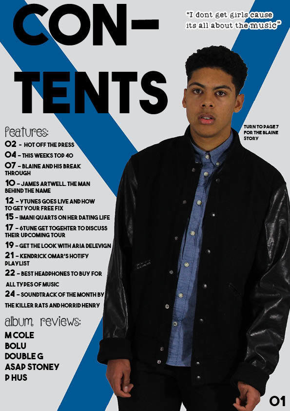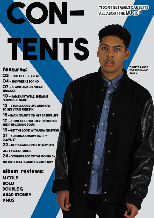 The poses that my models did in my studio photoshoot were inspired by the 'don't care' attitude that many other artists have towards their music and how they are portrayed in the media. James, who is on my front cover and on my double page spread captured this pose and mind-set completely. The pose that I chose for my front cover was a picture of James with his hands in his pockets. This shows slight attitude and from my research this is what many R&B magazines show. For my contents page the model I decided to use, Blaine, shows the same attitude with his pose as he is looking directly at the camera with his arms by his side looking very relaxed and now showing that anything is really bothering him. When researching contents pages there are usually just 1 or 2 people on the page and getting Blaine to pose like this, slightly to one side, allowed me to just have 1 person without it looking too empty.
