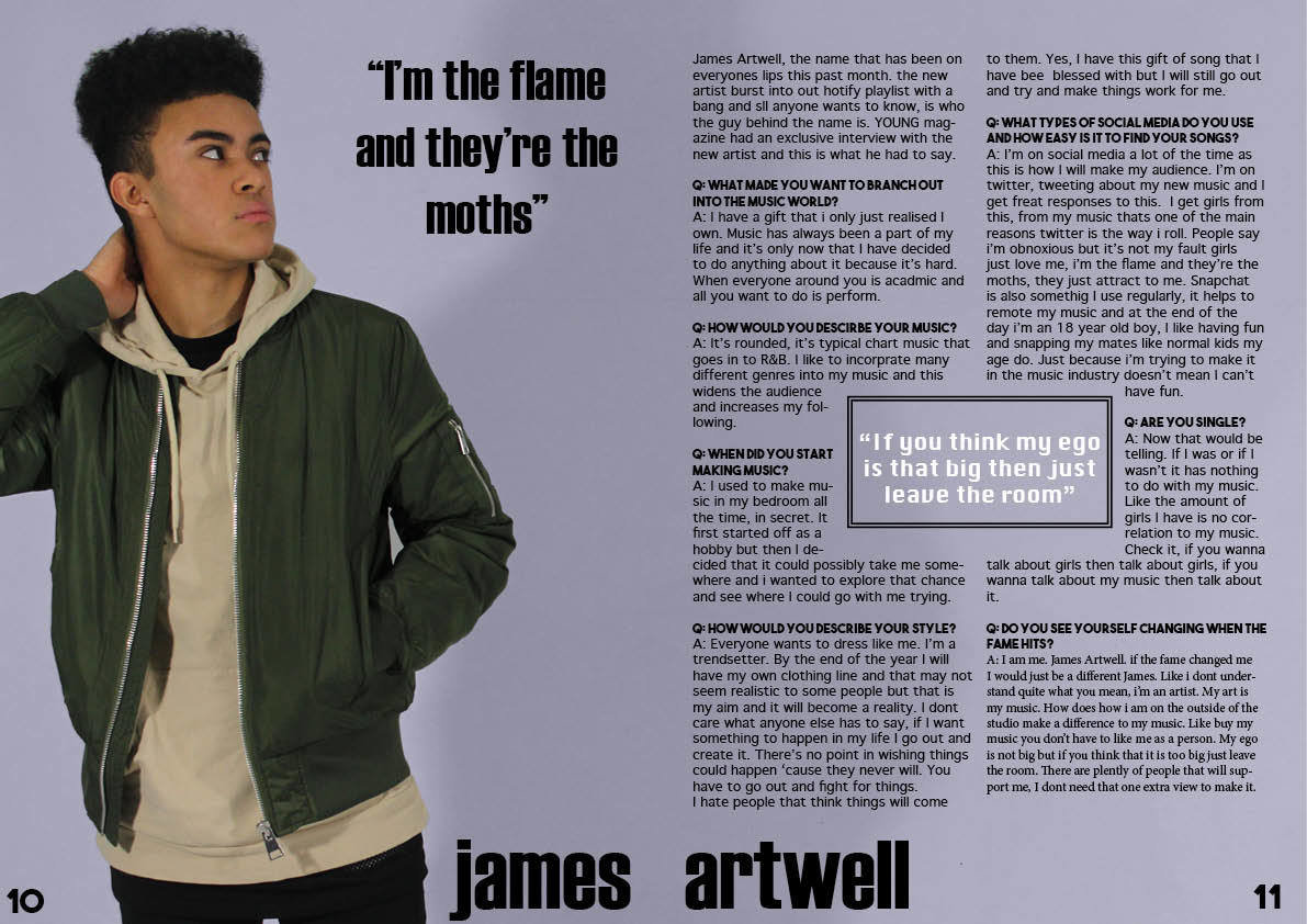 This is the first draft of my double page spread and I decided to use this picture of James as he is looking up to the article and it adds another element of audience relationship. The title of the article is placed at the bottom which challenges general conventions. There are two pullquotes, one in the middle of the article, and one next to the article. This has been placed there to fill up the blank space around the model. The fonts for the pull quotes and for the title of the article have bee done in the same font which bring the magazine together and doesn't make anything look out of place in regard to fonts.