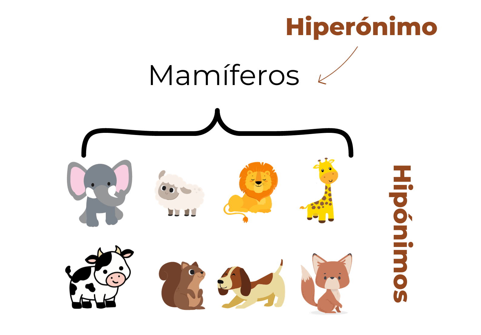 Grupo de palabras que comparten algún rasgo en su significado. Hay un hiperónimo (la palabra que incluye a las otras) e hipónimos (las palabras que están dentro del hiperónimo).