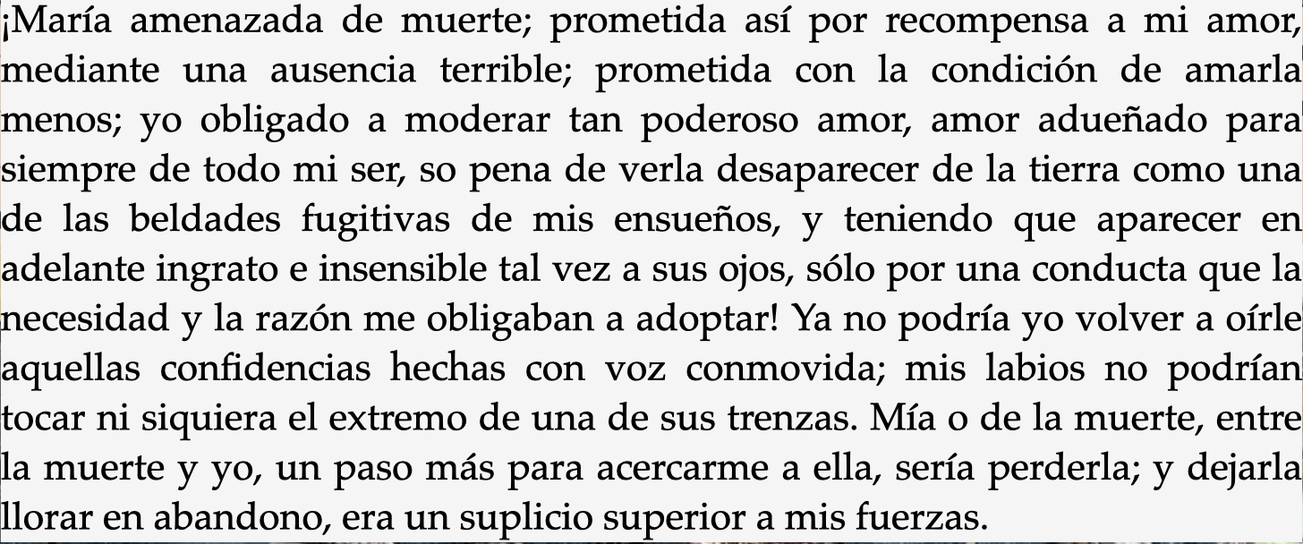 Este amor es eterno pues cubre la totalidad de la vida del personaje que narra y se ha inmortalizado en las páginas de la novela de Isaacs, y al mismo tiempo trágico, funesto, irrealizado. En "María" encontramos el amor que aguarda, la paciencia pura, la resignación que jamás es vencida y que, al contrario, se acrecienta con los obstáculos. Es el amor que destruye la materia antes que agotarse en sí mismo. En ella el amor todo lo puede porque es espiritual.
