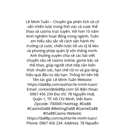 Website: https://da88p.com/author/le-minh-tuan/. Lê Minh Tuấn – Chuyên gia phân tích và cố vấn chiến lược trong lĩnh vực cá cược thể thao và casino trực tuyến. Với hơn 10 năm kinh nghiệm hoạt động trong ngành, Tuấn am hiểu sâu sắc về cách vận hành th